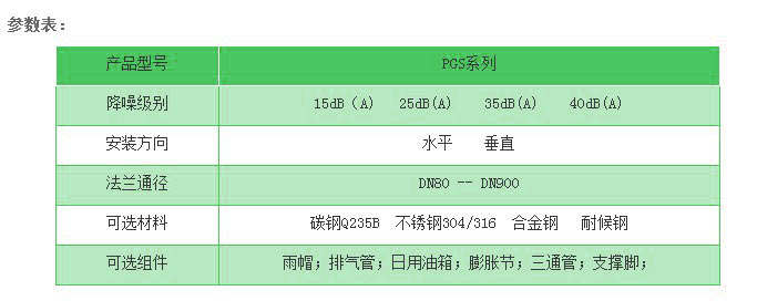 產(chǎn)品選型:PGS系列以進(jìn)排氣口直徑標(biāo)示尺寸,最小為80MM,每個尺寸等級為25MM的整數(shù)倍。例如,需要住宅級消聲器,法蘭接口尺寸為DN200,消聲器型號為:PGS25-200。