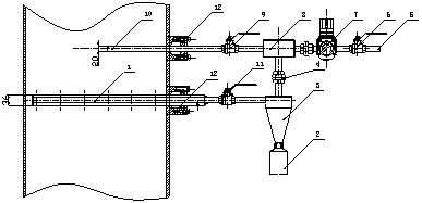 1、取樣管2、取樣瓶3、分離器4、活接頭5、壓縮空氣接管6、壓縮空氣閥7、調(diào)壓閥8、抽氣器9、吹掃閥10、射氣管11、取樣閥12、安裝固定法蘭