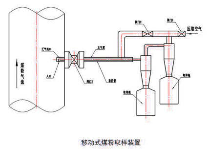 新型煤粉取樣器的工作原理如下:首先將安裝在固定座上并緊靠一次風(fēng)管的隔離閥門打開,固定式新型煤粉取樣裝置通過轉(zhuǎn)動(dòng)進(jìn)退傳動(dòng)裝置的手柄(移動(dòng)式新型煤粉取樣裝置則通過人工),將連為一體的取樣管和乏氣排放管伸入一次管內(nèi)的取樣位置,打開壓縮空氣閥門,壓縮空氣流經(jīng)文丘里抽氣器時(shí)產(chǎn)生負(fù)壓,將一次風(fēng)管中的空氣和煤粉混合物,通過取樣管被吸入旋風(fēng)式的煤粉分離器,進(jìn)行氣、粉分離,分離下來(lái)的煤粉顆粒落入取樣罐中,乏氣經(jīng)抽氣器引射管和乏氣排放管返回一次風(fēng)管。每次取樣時(shí)間大約3-5分鐘。最后在實(shí)驗(yàn)室中對(duì)所取得樣本稱重篩選,以確定煤粉顆粒細(xì)度。