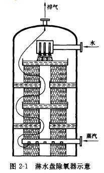 加熱蒸汽(即來自汽輪機的抽汽)從下部接管進人除氧器內(nèi),由配汽裝置作均布,流向四周空間,蒸汽向上流動,在最下層淋水盤的中央通汽口處轉(zhuǎn)彎向上,然后經(jīng)其上一層的中央淋水盤阻擋而轉(zhuǎn)彎,在中央淋水盤與圓筒內(nèi)壁間的環(huán)形空間處轉(zhuǎn)彎向上,如此一層層向上流動,最終到達除氧器頂部,蒸汽攜帶著氧氣由頂部排氣管流出除氧器。這樣加熱蒸汽垂直于水流,二者成十字形的接觸,成直接接觸的傳熱,水流自最上層淋水盤起一層層逐步加熱至最下層達到沸點飽和溫度,而逐步加熱的過程也是溶解在水中的氧氣因溫度升高而溶解度降低的逐步脫氧的過程,最終到達最下- -層后使水中的氧氣脫盡,使殘余含氧量達到規(guī)定標準。