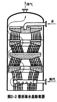 圖2-2所示為一錐形淋水盤除氧器。水從上部進水管進人第一層水盤中央,經(jīng)溢流而沿圓周均布流人淋水盤內(nèi)。淋水盤成斜度較小的錐形,由于盤底的傾斜使淋水孔流出的水成傾斜的細水流。其優(yōu)點是出力較低時水位降低,一部分孔無水,而其余的孔在一定的水位之下仍能形成細小水柱流出,避免了平底盤低水量時不能形成細小水柱而出現(xiàn)不規(guī)則大水滴的局面,這些水柱仍能保持一定量的傳熱面,使傳熱和脫氧保持了一定效果而不致惡化。但在過度超負荷時與前述淋水盤一樣水可能會從邊緣溢出。