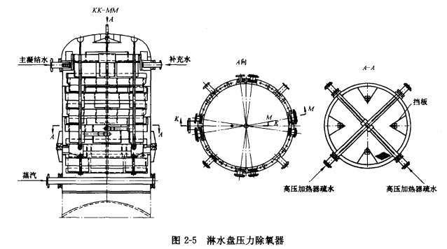蒸汽從簡殼下部的進口接管進入管內(nèi),管上開有排孔,蒸汽從孔內(nèi)流出到除氧器空間,經(jīng)各淋水盤阻擋而逐步轉(zhuǎn)彎向上流動至頂部出口,淋水盤之間焊有擋板(見圖2-5中的A-A截面圖),使蒸汽沿著擋板隔成的通道流動。