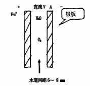 第二步電化學(xué)除氣。除氧設(shè)備內(nèi)設(shè)置電解池,電解池陰極板和陽極板組成水道,構(gòu)成極板總成,水在兩極間通過。如下圖所示: