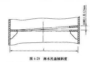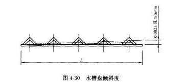 淋水盤(包括各種配水淋水盤)及其托盤的裝配安裝至關(guān)重要,其傾斜將造成水流斜向一側(cè)而使出水細(xì)流不均以致影響傳熱和除氧性能。淋水托盤支撐架徑向傾斜度偏差在土2mm/m,且總偏差在土5mm之內(nèi),見圖4-29。