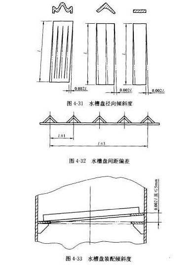 規(guī)則填料(水槽盤)設(shè)計(jì)結(jié)構(gòu)形式多種多樣,有W型、角鋼型、扁鋼型、半圓型等,如裝配成上下傾斜,會(huì)造成水流不均,下端水流名而上端水流少,以致影響性能。水槽盤水平線裝配縱向及徑向傾斜度偏差在土2mm/m以內(nèi),且總偏差在土5mm之內(nèi),見圖4-30.水槽盤裝配的傾斜度在土2mm/m之內(nèi),見圖4-31。兩水槽盤中心間的距離偏差在士1mm之內(nèi),任意兩水槽盤中心間的距離偏差在土3mm之內(nèi),見圖4-32。水槽盤裝配的傾斜度在土2mm/m之內(nèi),且小于等于5mm,見圖4-33。