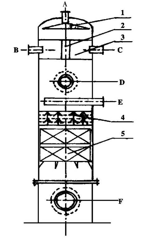 總體結(jié)構(gòu)旋膜式除氧器結(jié)構(gòu)簡(jiǎn)圖見(jiàn)圖1。由圖示可以看出,旋膜式除氧器內(nèi)部設(shè)計(jì)成兩級(jí)除氧裝置。第一級(jí)除氧裝置由起膜裝置和淋水篦子組成。起膜裝置是由起膜噴管和固定噴管的上下管板組成,上下管板焊接在除氧頭的內(nèi)壁,管板包容的空間成為進(jìn)水室。淋水篦子由保持一定間距的5層3號(hào)A—排氧管;B—化學(xué)除鹽水管;C—凝結(jié)水管;D—二次加熱蒸汽管;E—高加疏水管;F—加熱蒸汽管;1—折流板;2—起膜管;3—起膜裝置;4—淋水篦子;5—液汽網(wǎng);圖1旋膜式除氧器結(jié)構(gòu)簡(jiǎn)圖角鋼構(gòu)成。