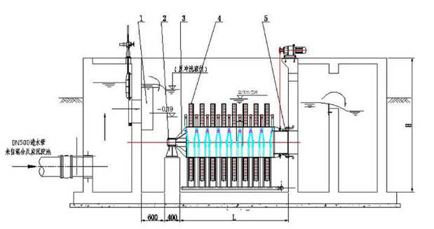 (3)排泥:纖維轉(zhuǎn)盤過濾器轉(zhuǎn)盤下設(shè)有斗型池底,有利于池底污泥收集。池底污泥沉積減少了濾布上的污泥量,可延長過濾時(shí)間,減少反沖洗水量。經(jīng)過一設(shè)定的時(shí)間段,控制盤啟動(dòng)排泥泵,通過池底穿孔排泥管、閥、泵將污泥排至污泥系統(tǒng)。其中,排泥間隔時(shí)間及排泥歷時(shí)可以調(diào)整。
